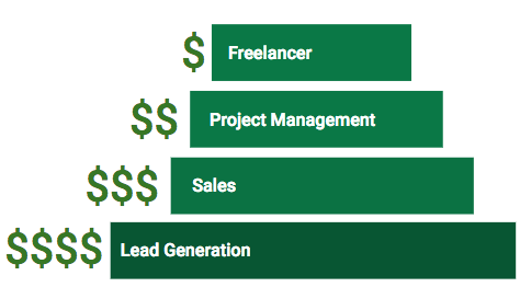 Is this bad? Yes, because you are at the end of the value chain. You make the least money. Naturally, managing clients expectations with workers (project management) are more important than just doing the work. But, project managers are useless without the sales team. Without Sales there are no clients, hence there is no business. This means that sales commissions are going to be higher than let’s say development work. However, salespeople don’t have prospects to talk to (leads) if there is no lead generation system in place. Hence this is the highest paid part of the entire business model. Here is what the value chain looks like, and why you are being paid the least:
